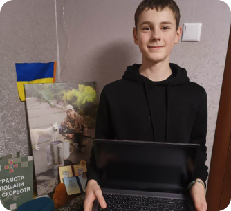 14-річний Ярослав родом з Луганська. Згодом сім'я переїхала до Бучі. Війна змусила їх двічі покинути рідний дім. Тата хлопчик втратив, а вітчим загинув під час окупації. Весь цей час триматися Ярославу допомагає давнє захоплення — програмування. Завдяки фонду "Діти Героїв" Ярослав отримав сучасний комп'ютер та можливість безкоштовно навчатися в ІТ-школі GoIteens. У свої 14 років він вже володіє мовами програмування та створює власні ігри!  Ярослав мріє стати успішним програмістом та розвивати свою країну, а ми допомагаємо реалізувати його мрію
